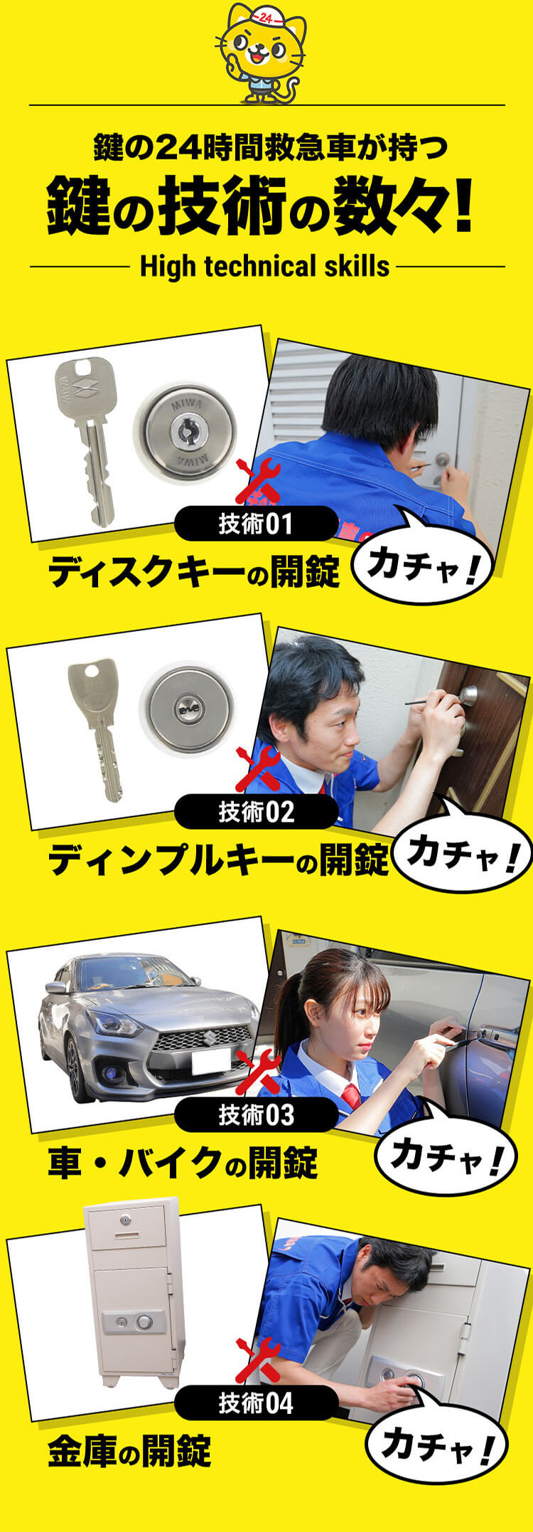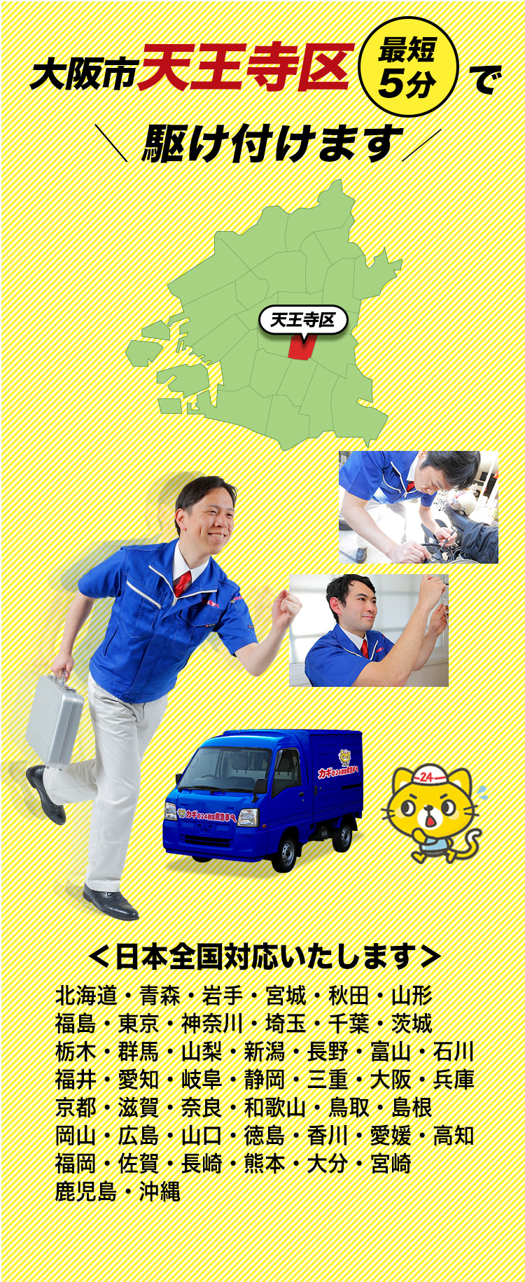 天王寺区で高く評価されている「カギの出張24時間」は天王寺、阿倍野エリアで迅速にご対応します。透明でわかりやすい説明と正確な見積もりを基に、お客様の信頼を第一に考えています。地域に密着した親切丁寧なサービスを提供し、作業完了後にはお客様からのフィードバックを受けて、サービス品質を継続的に向上させています。